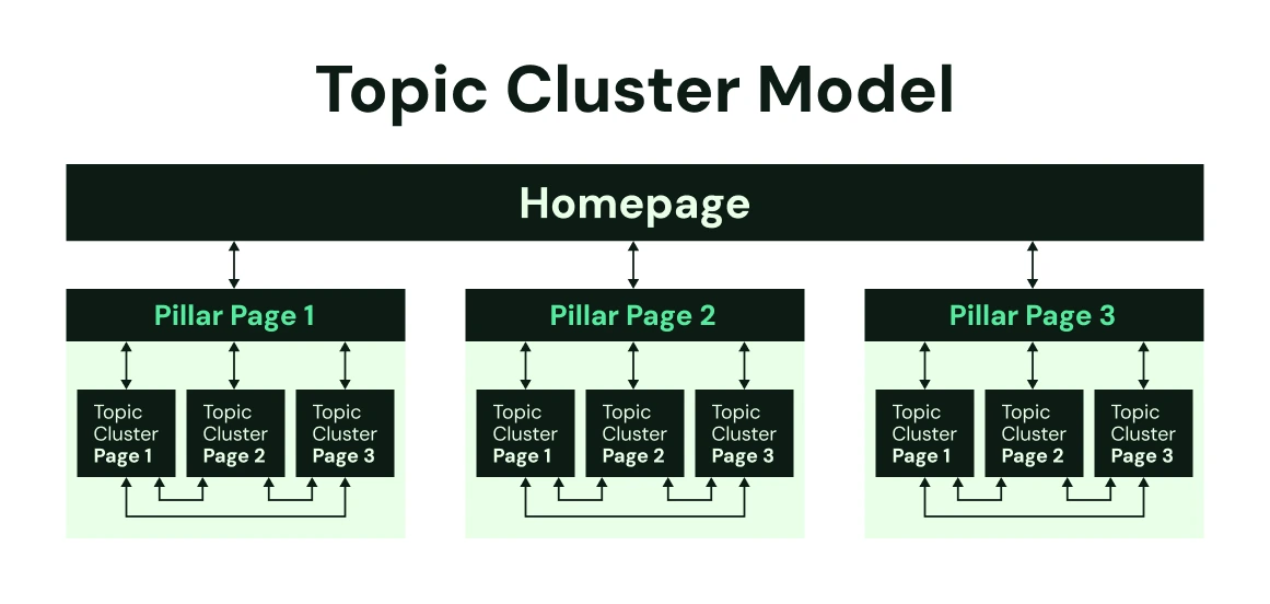 - Multiple cluster pages address specific subtopics and link back to the pillar